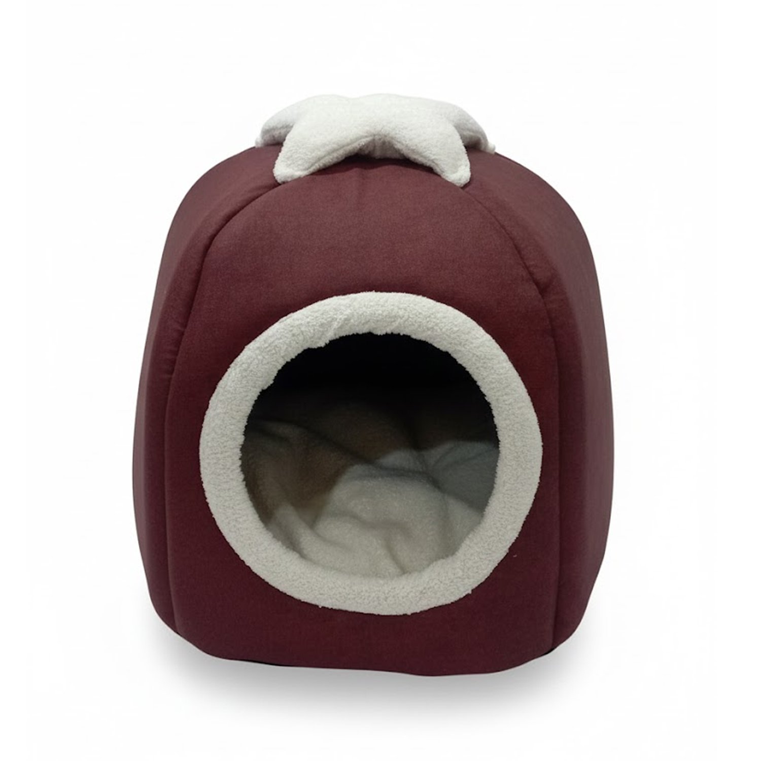 Benzersiz Tasarım: Beyaz ve canlı Kahverengi renklerin uyumuyla hazırlanan bu iglo tarzı yatak, üst kısmındaki beyaz yıldız (veya çilek sapı) detayı ile ev dekorasyonunuza neşe katar.