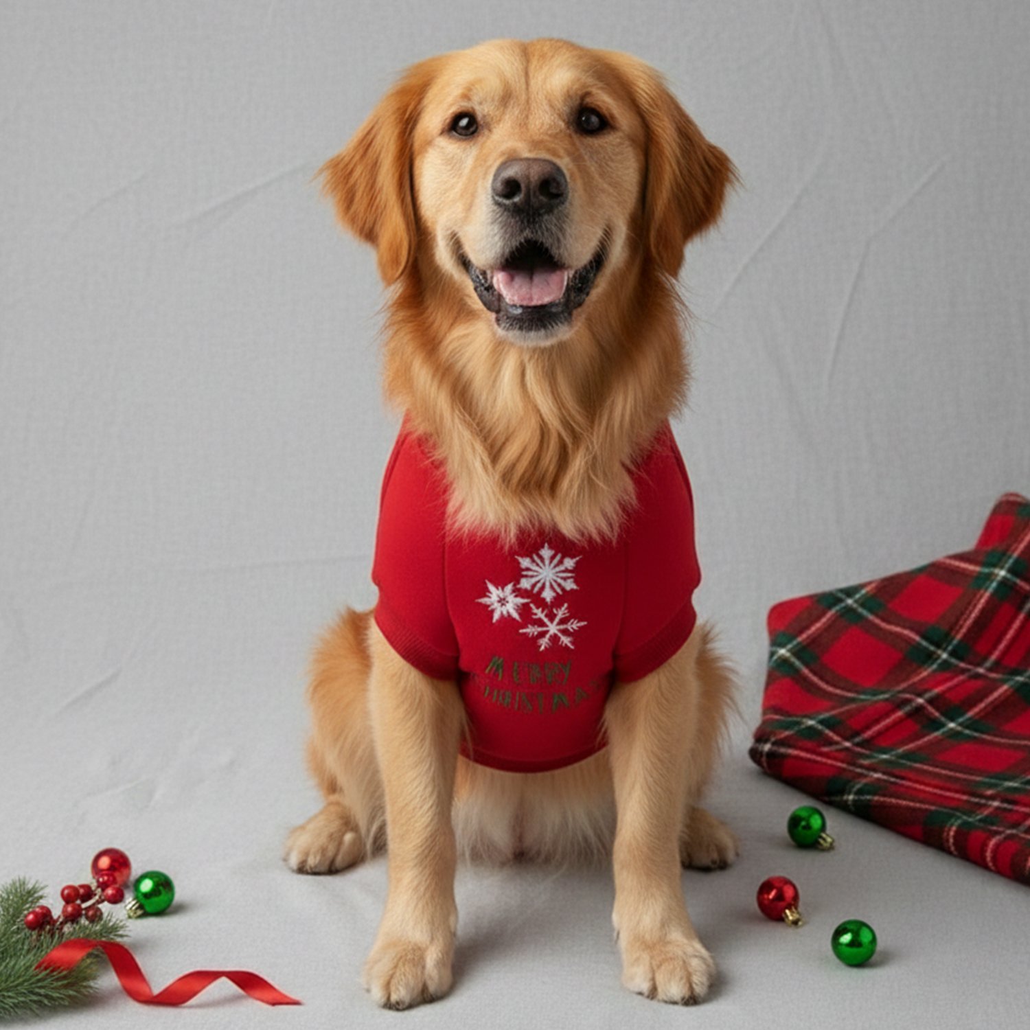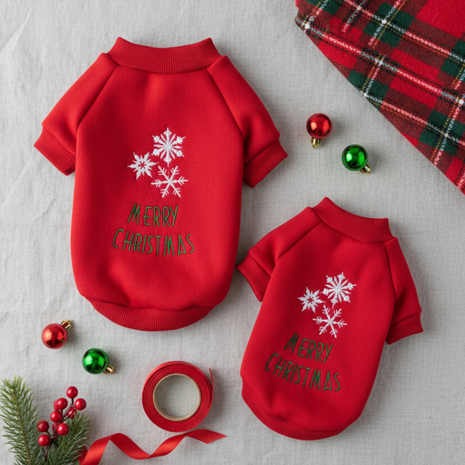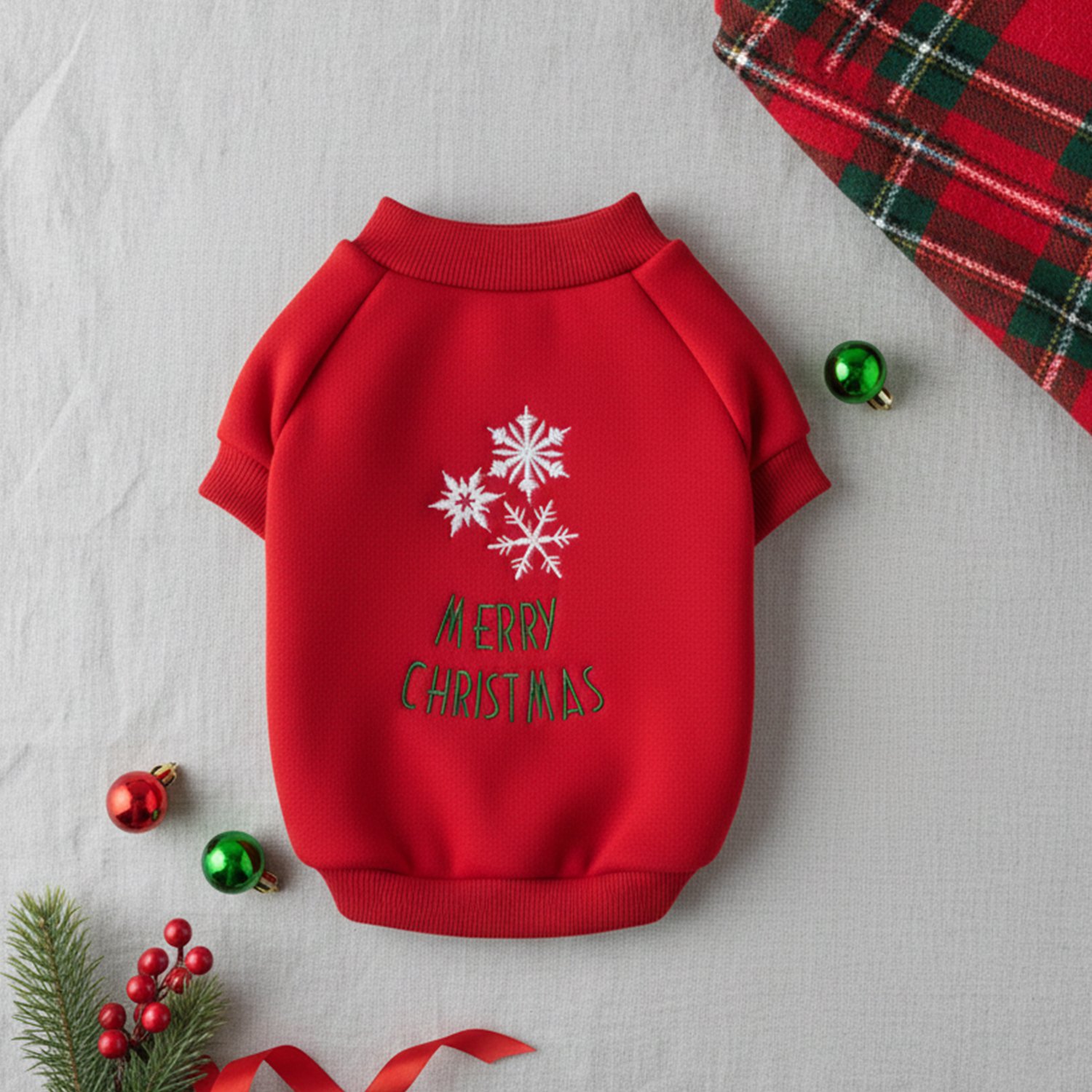 Frosty Christmas Köpek Sweatshirtü, minik dostunuza yılbaşı ruhunu sade ve şık bir tasarımla sunar. Canlı kırmızı kumaşı üzerine işlenen zarif beyaz kar taneleri ve "Merry Christmas" nakışı, kış mevsiminin büyüsünü tam anlamıyla yansıtır. Minimal fakat etkileyici tasarımı sayesinde hem günlük kullanımda hem de yılbaşı temalı etkinliklerde mükemmel bir tercihtir.
