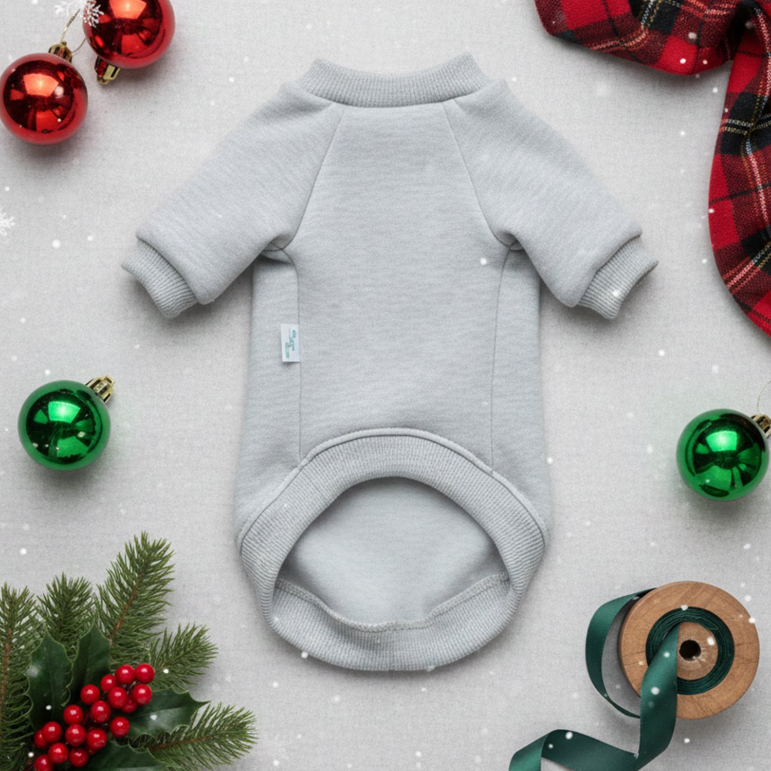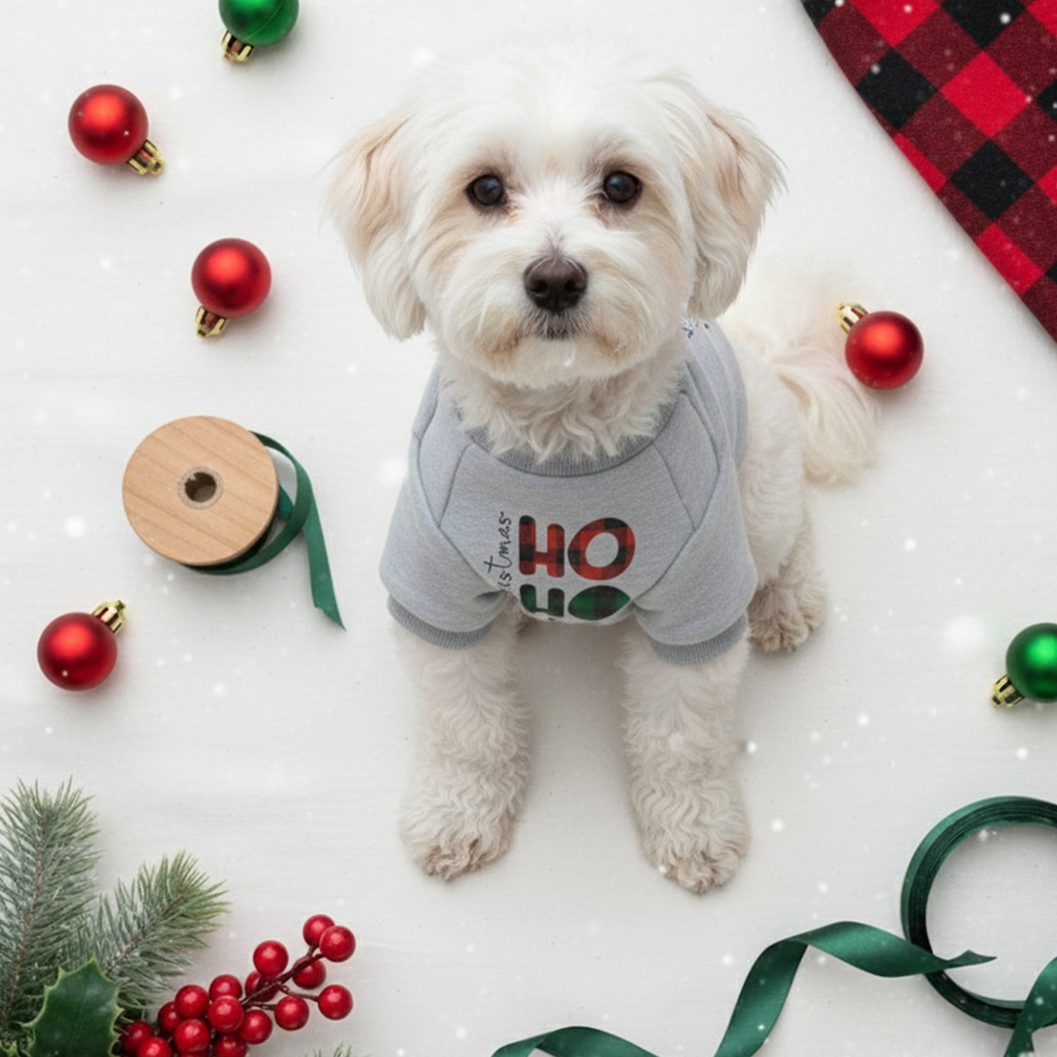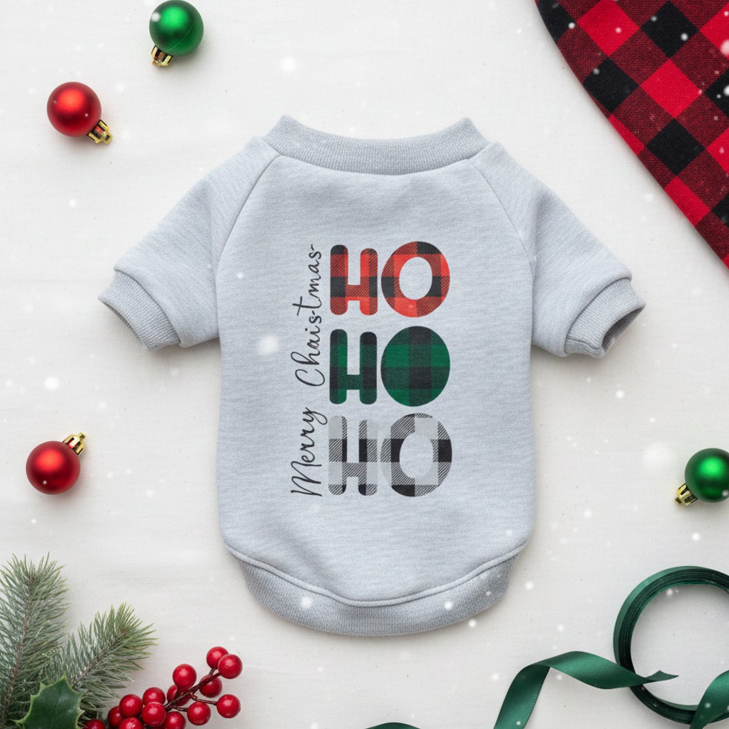 Sezonun en sevimli yeni yıl tarzını pati dostunuza taşıyın! Plaid Ho Ho Ho Yeni Yıl Köpek Sweatshirtü, yumuşak gri kumaşı ve kırmızı–yeşil ekose detaylı “HO HO HO” baskısıyla hem şık hem de sıcacık bir görünüm sunar.