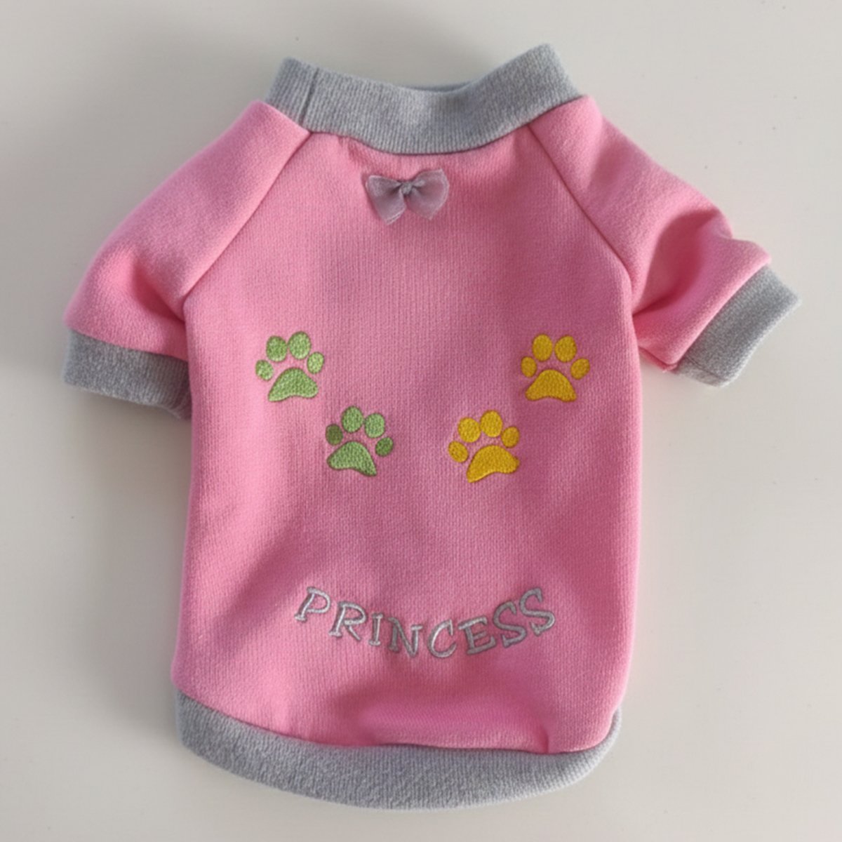 Tasarım Detayı: Üzerindeki renkli pati izi nakışları ve yaka altındaki minik fiyonk detayı, ürüne eşsiz bir sevimlilik katar.