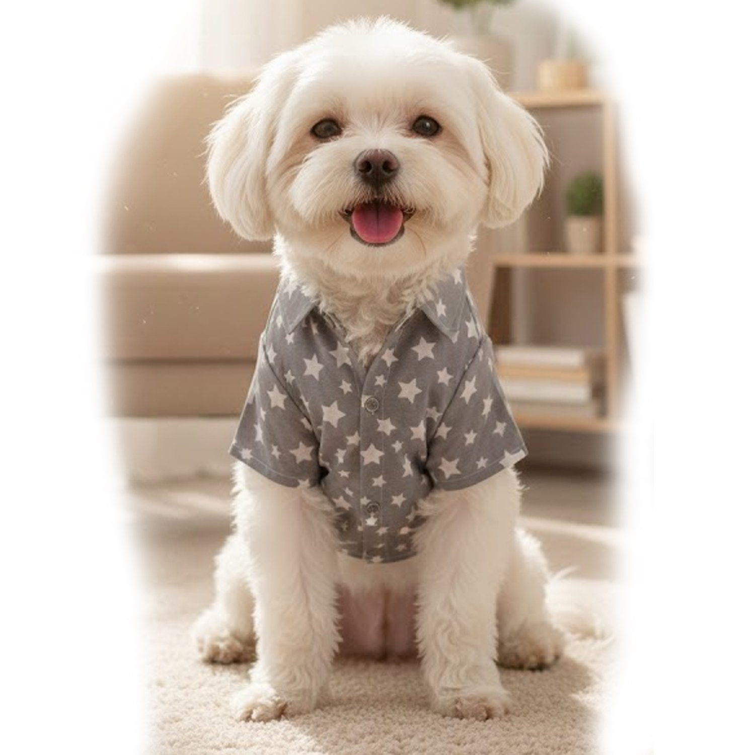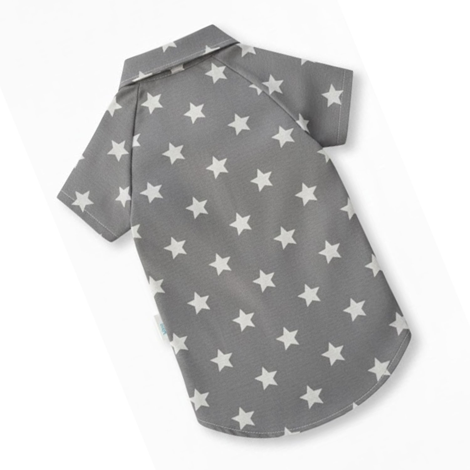 StarryGrey Yıldız Desenli Gömlek, kedi ve köpek dostlarımıza hem zarif hem de eğlenceli bir görünüm kazandıran özel bir tasarımdır. Gri zemin üzerine işlenmiş beyaz yıldız motifleri, gece gökyüzünün sakin ve şık havasını dostunuzun stiline taşır.