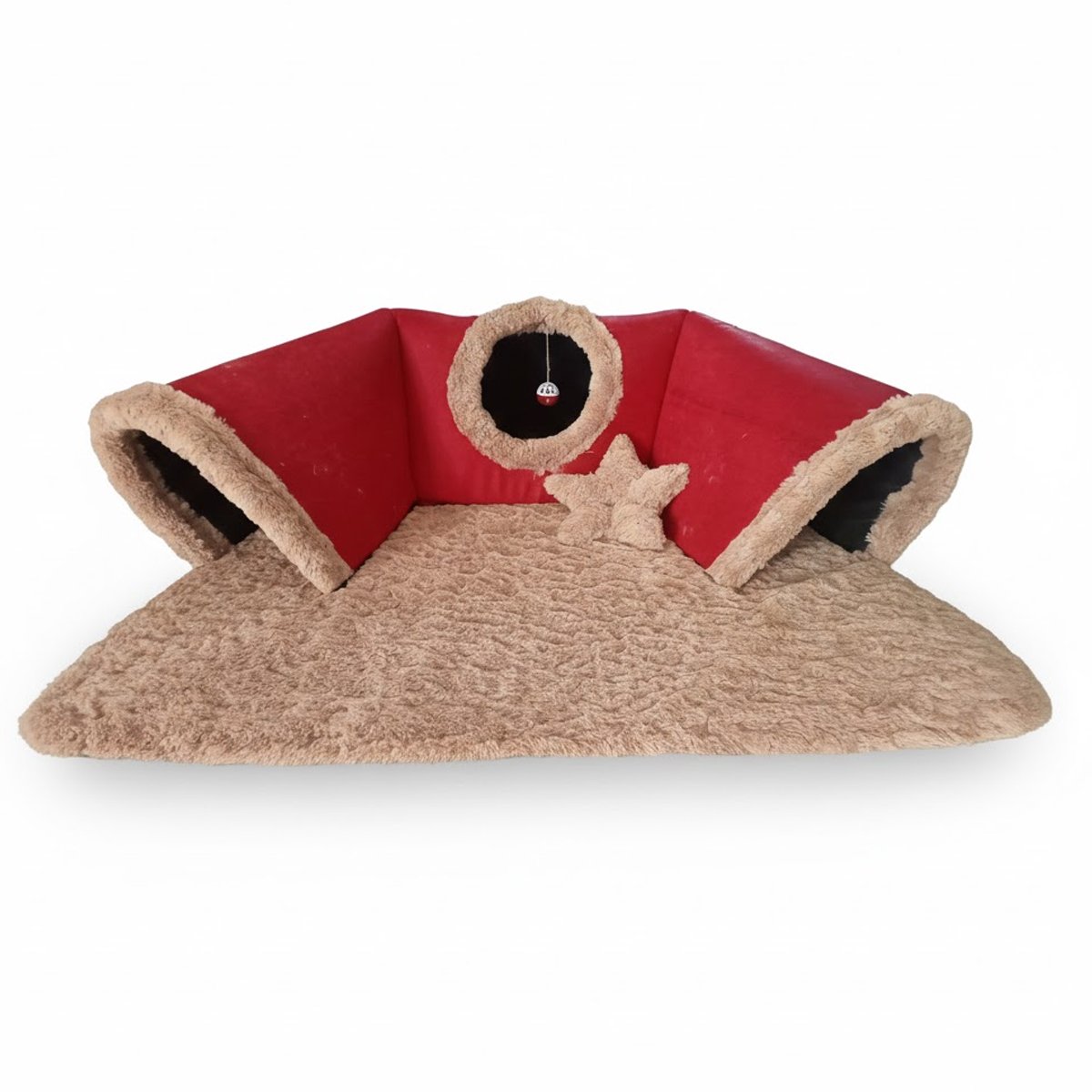 Yatağın alt tabanı, üzerinde yürümesi ve dinlenmesi için ekstra yumuşak, peluş yüzeyli bir halı görevi görür. Kırmızı ve bej renklerin sıcak uyumuyla evinizin köşelerine şık bir dokunuş katan bu kedi & köpek yatağı, hafif ve portatif yapısı sayesinde kolayca taşınabilir ve depolanabilir.